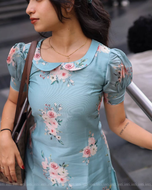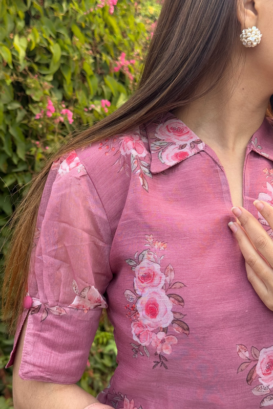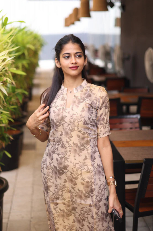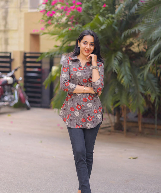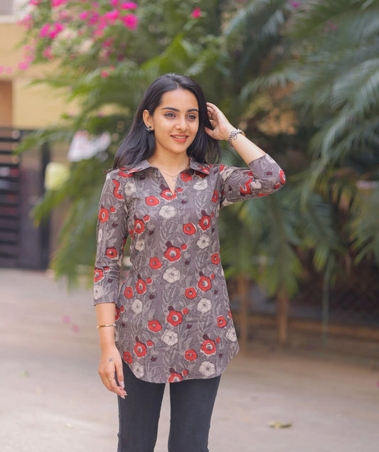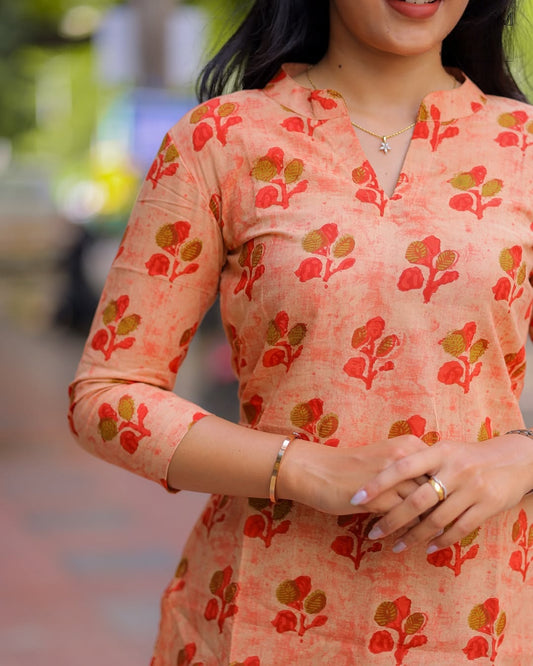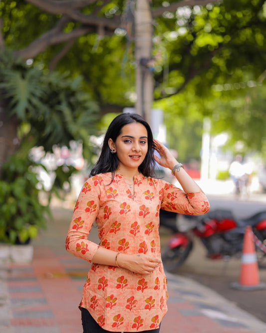 Floral Printed Mandarin Collar Cotton Short Kurti