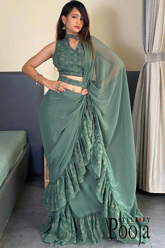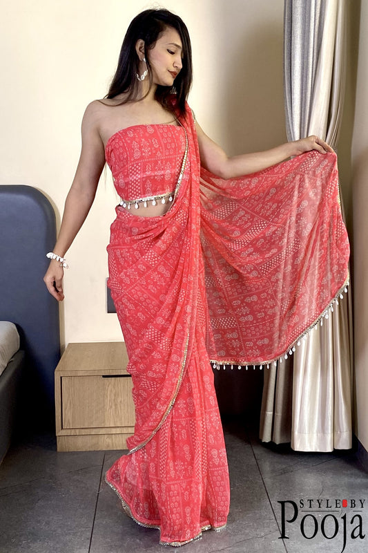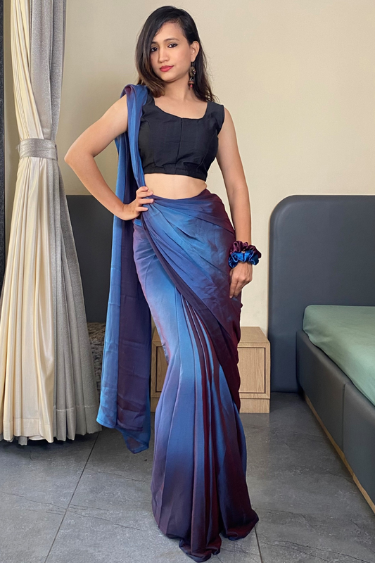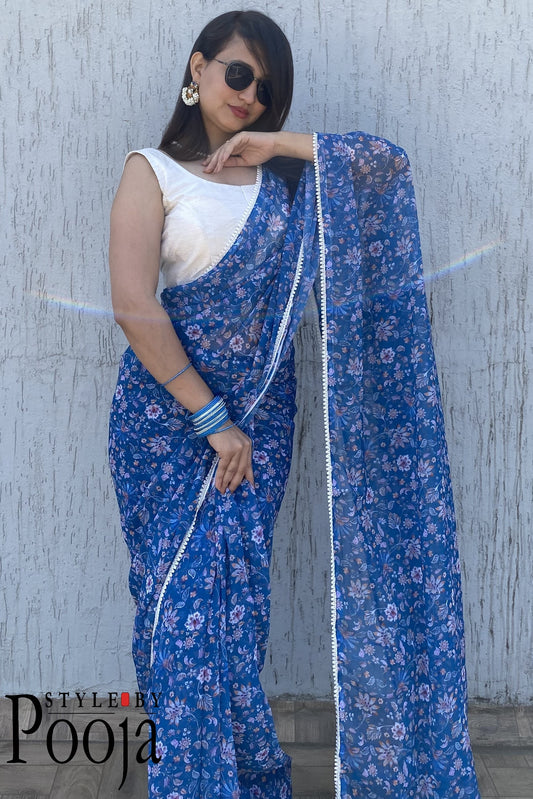 1 Min Ready to Wear Blue & White Digital Print Georgette Saree