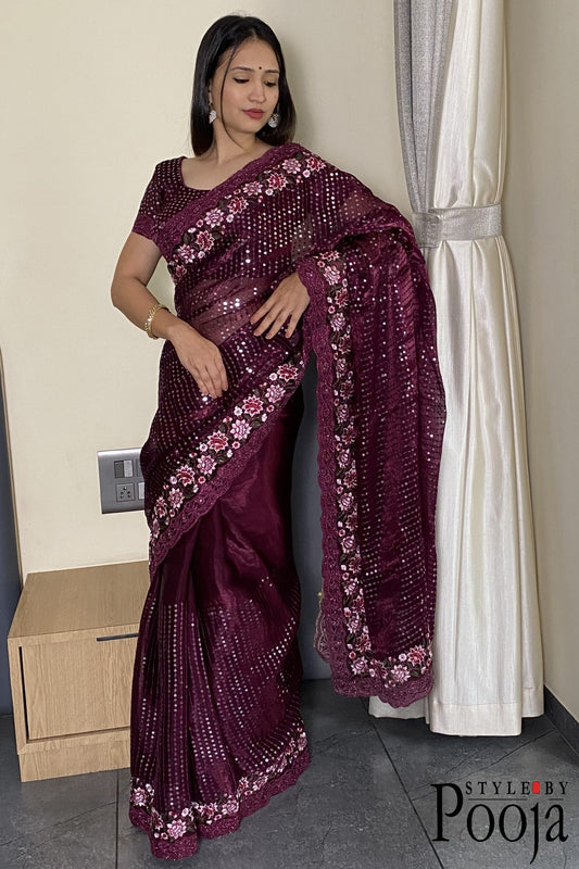 Wine Jimmy Choo Heavy Premium Party Wear Saree with Heavy Work